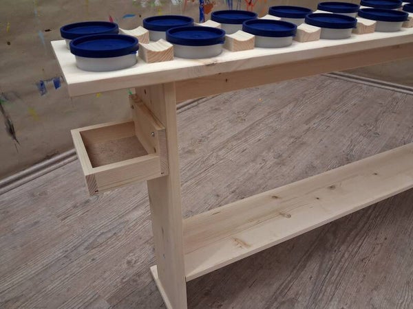 Unter dem Tisch befindet sich ein Ablagefach für den Farbvorrat.