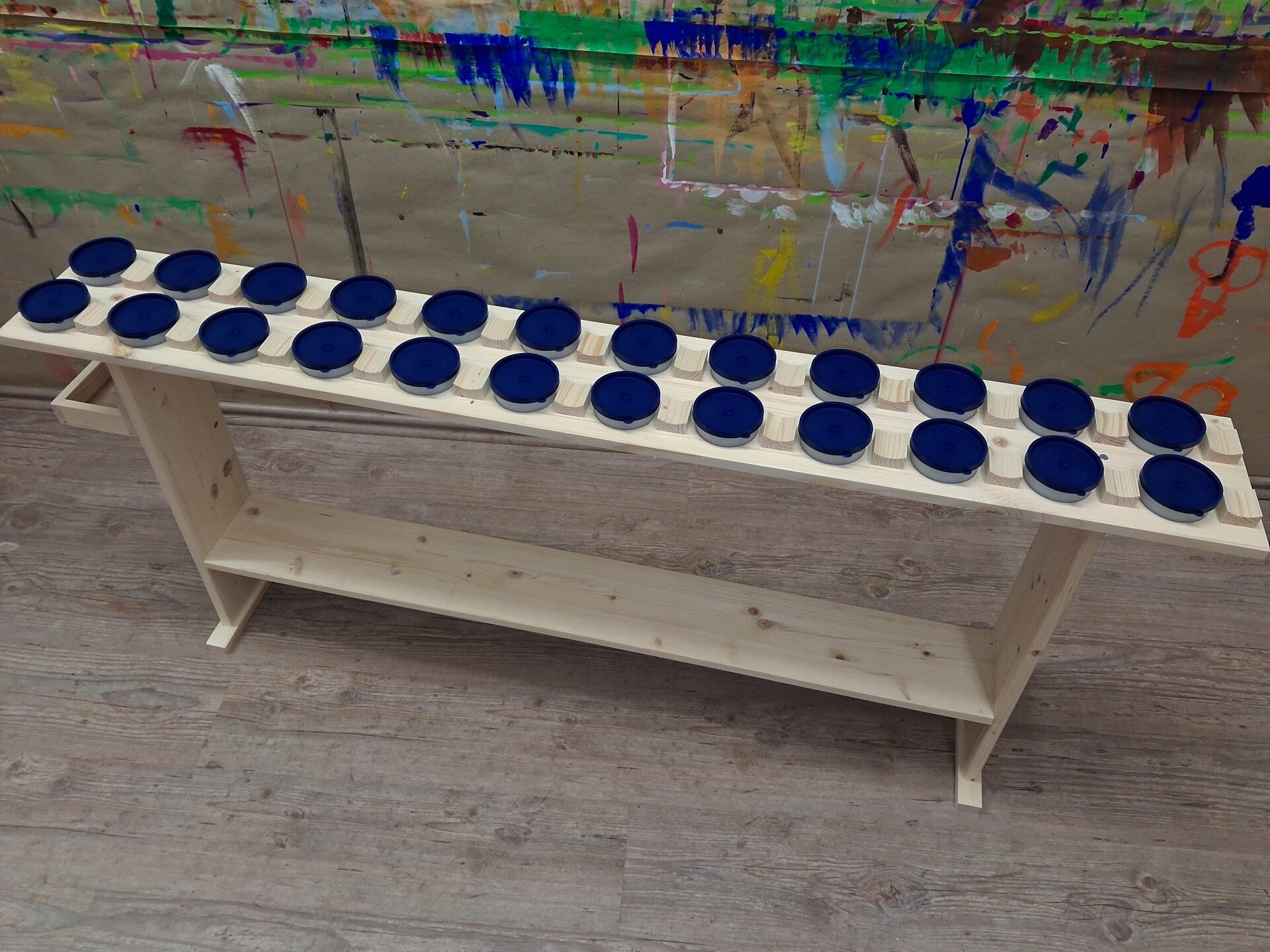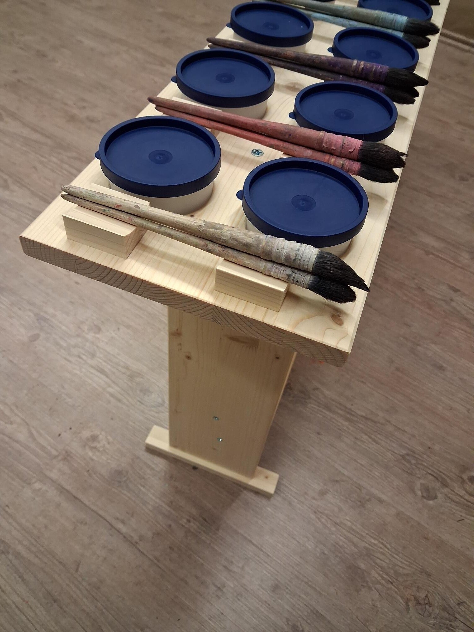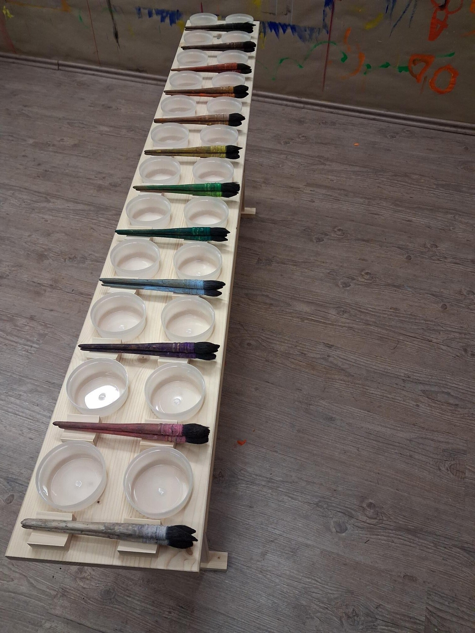 Auf dem Tisch befinden sich 12 Plätze für 12 verschiedene Farben. Zu jedem Platz gehören zwei dicht verschließbare Schälchen für Farbe und Wasser und eine Ablagemöglichkeit für drei Pinsel.